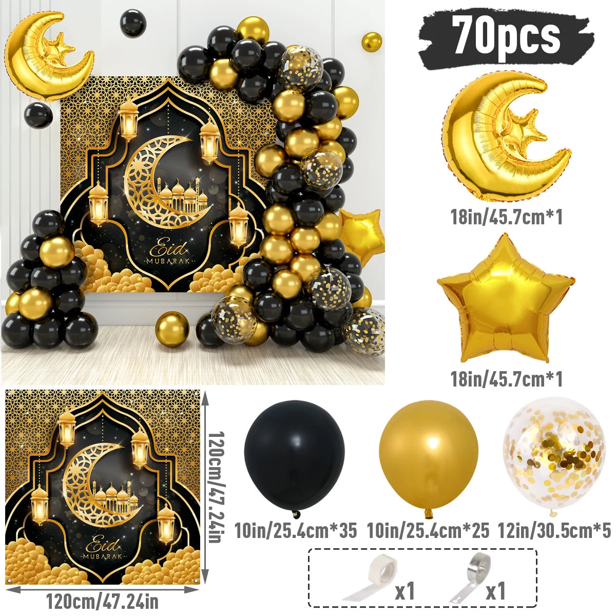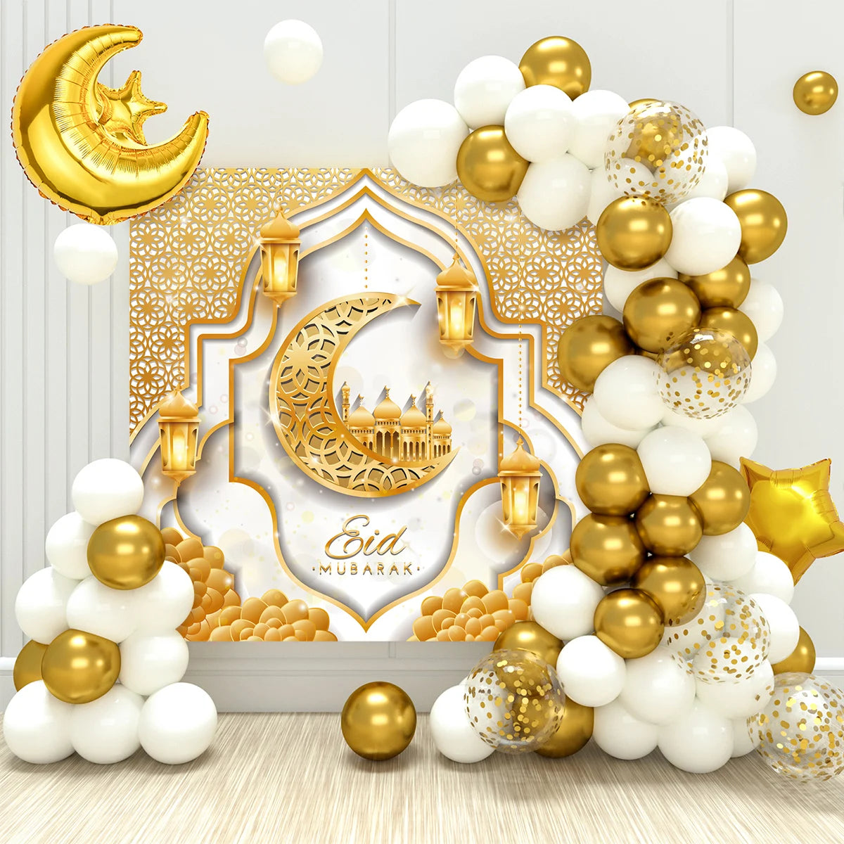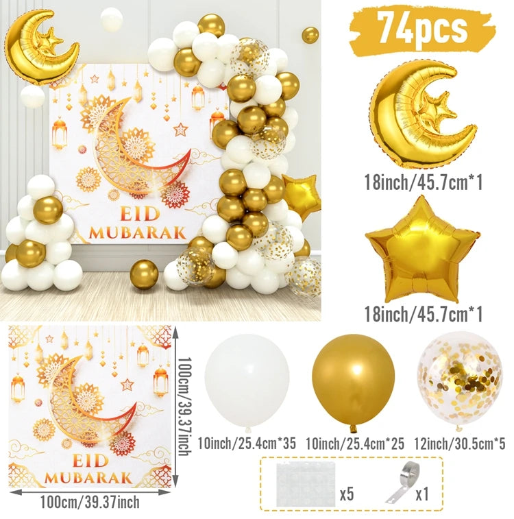 Create a magical atmosphere for your celebrations with the Eid Mubarak Green & Gold Balloon Garland Arch. This stunning decoration is perfect for adding a festive touch to your Eid al-Fitr gatherings or any special party.